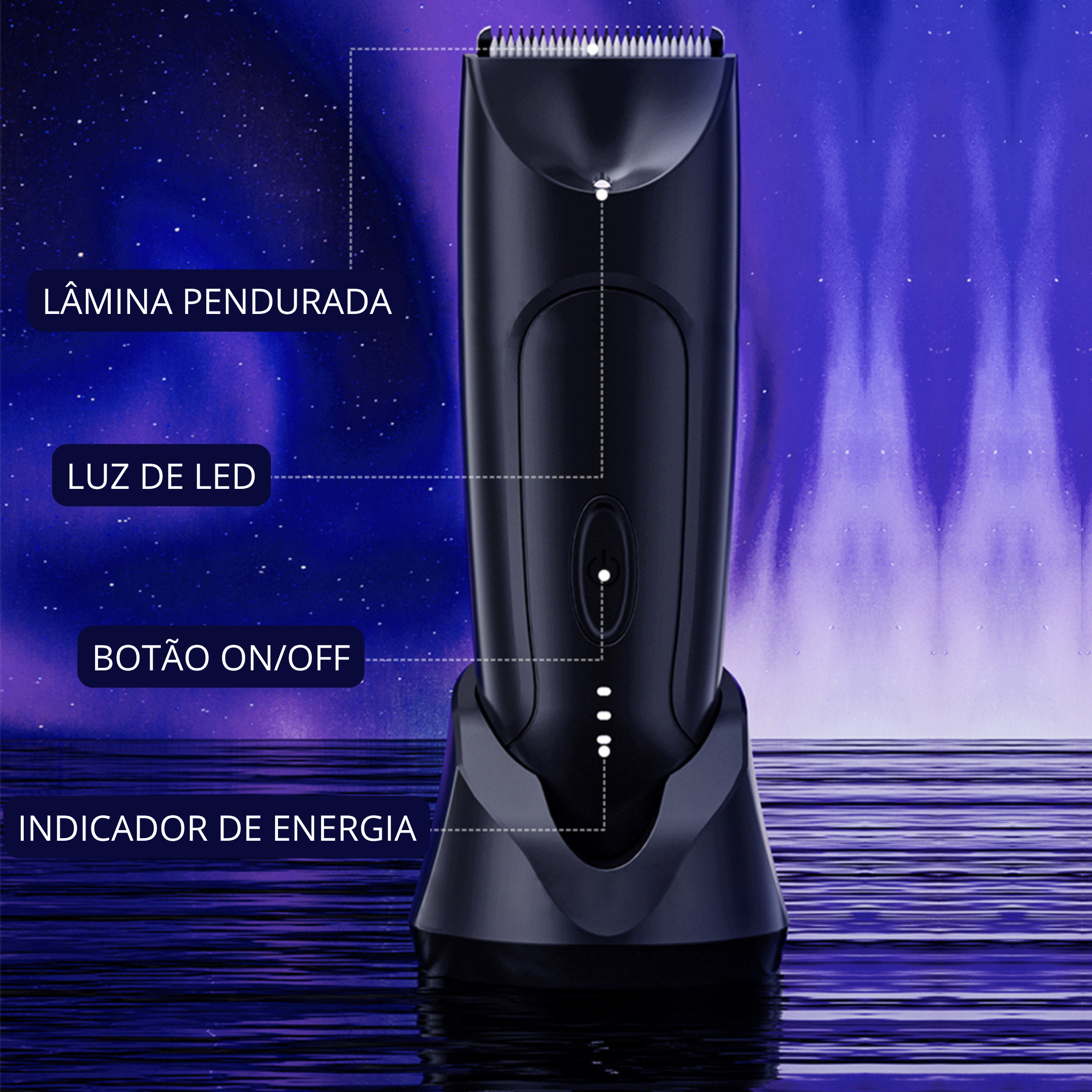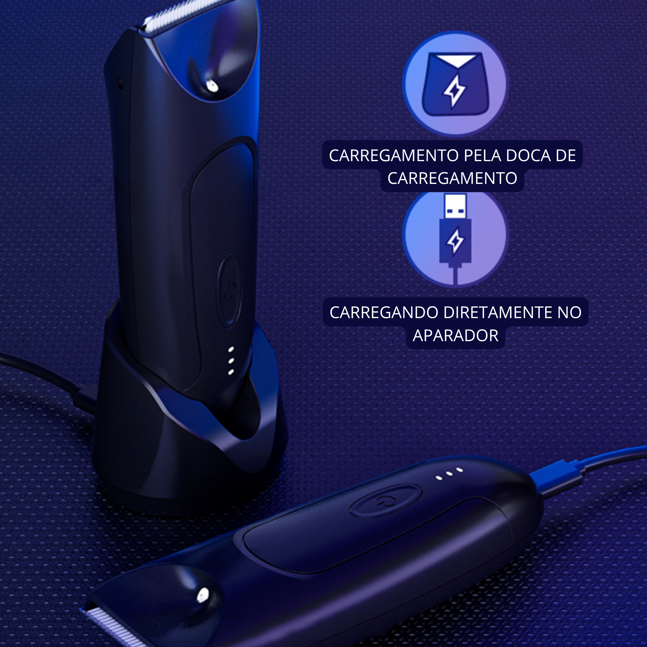 • Método de Carregamento Duplo: Oferece flexibilidade total com duas opções de recarga: utilize a elegante base de carregamento (dock) para manter sua bancada organizada, ou conecte o cabo USB diretamente no aparelho para maior praticidade em viagens.